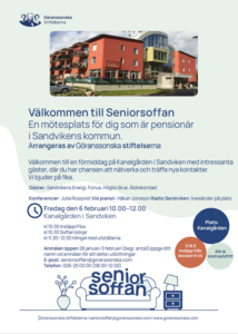 Missa inte att säkra din plats! Anmälan görs mellan 28 januari till 5 februari på mailen: seniorsoffan@goranssonska.com eller via telefon: 026-25 00 00.
