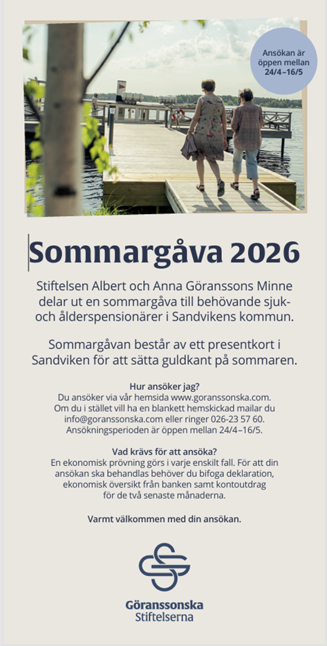 Stiftelsen Albert och Anna Göranssons Minne delar ut en sommargåva till behövande sjuk- och ålderspensionärer i Sandvikens kommun